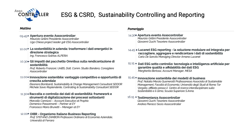 - Integrazione della Sostenibilità nel Controllo di Gestione: Analisi del ruolo del Controller nella gestione della sostenibilità aziendale e nell’integrazione dei parametri ESG nei processi decisionali e di controllo.